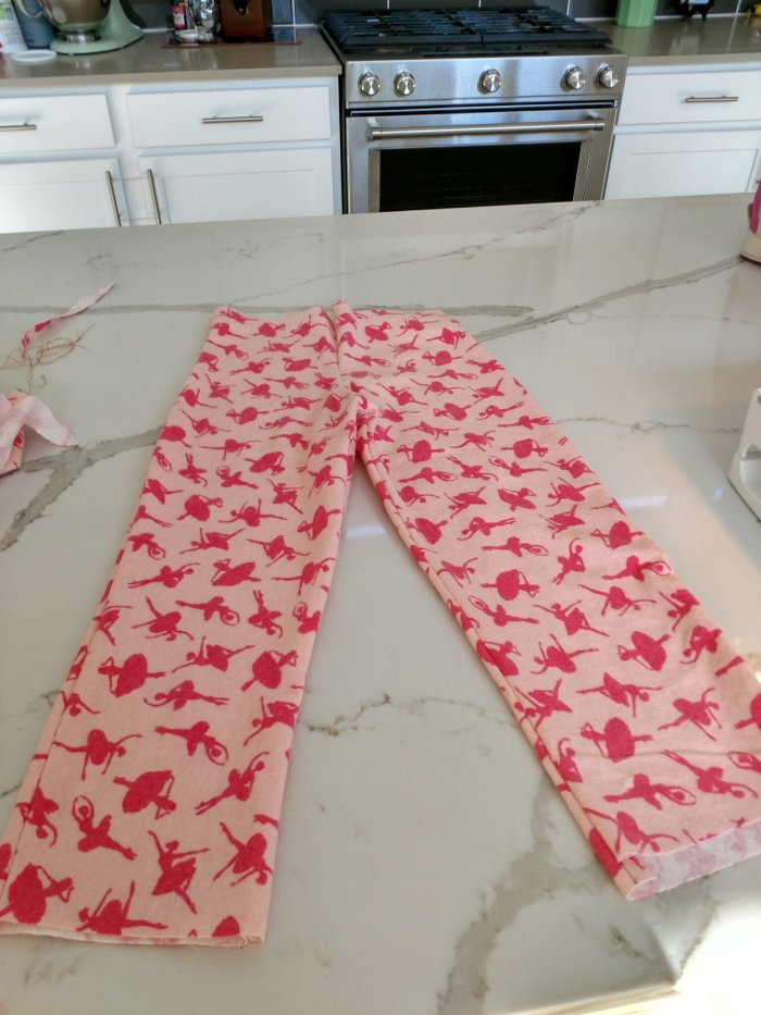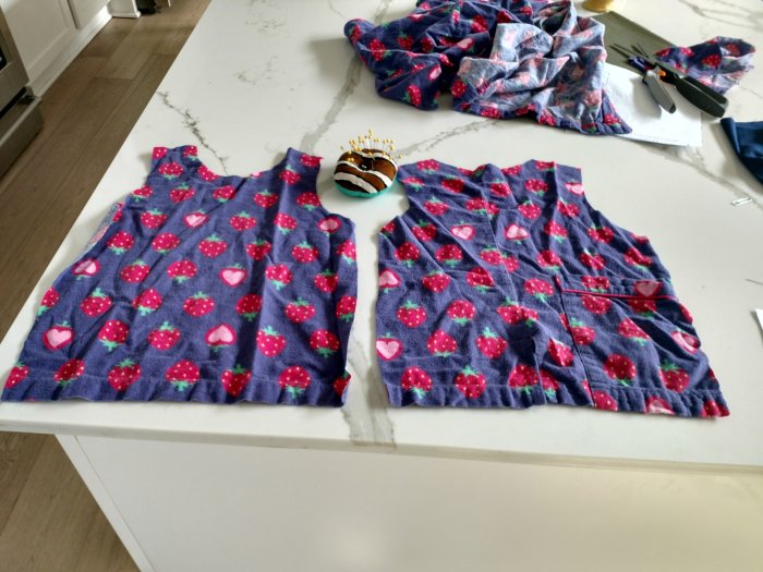 (Front is slightly shorter than the back). Also, I used random pieces from the old pajama shirt to get the most out of the fabric (didn’t have much extra) so it looks weirdly pieced together but I like it– and I managed to do it with what I had on hand– so 100% free!