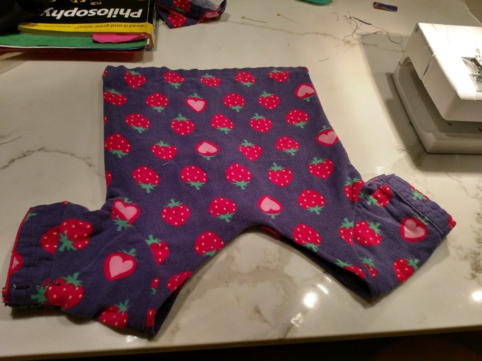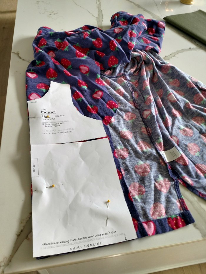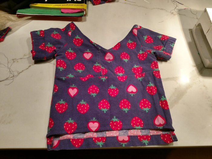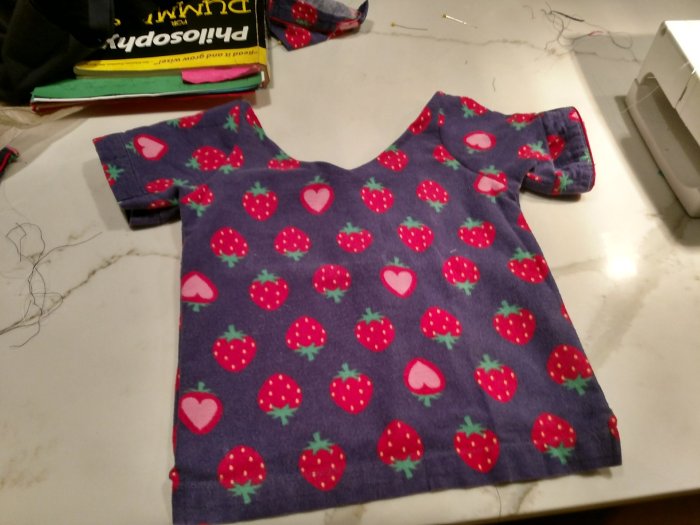 My challenge this week has been T-shirts and sleeves. A toddler pajama top would be a good start. Sleeves are terrible things to sew– at least for me– and after 5 tries (yes, 5…that’s 5 ruined, unsalvageable pajama tops) I finally made something that ever-so-slightly resembles a “shirt” and the finished product is at the bottom of this blog. (I used old bed sheets to practice– wouldn’t want to waste my adorable strawberry pajama fabric, albeit old).